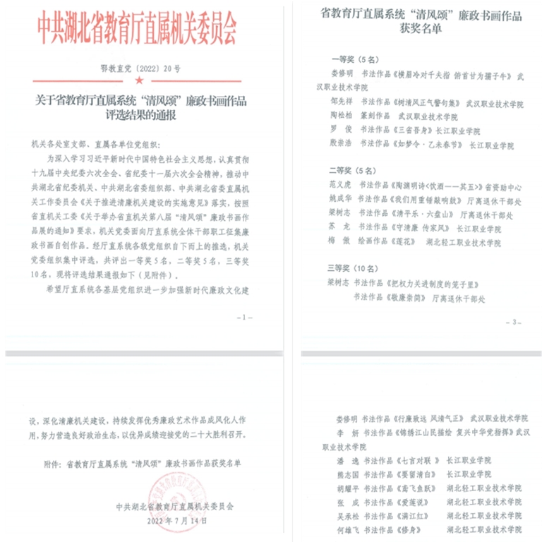 本网讯(通讯员王焜焜)近日,省教育厅直属系统举办第八届“清风颂”廉政书画作品展,长江职业学院教职工创作的多幅书画作品获奖,其中,2幅作品获得一等奖、1幅作品获得二等奖、2幅作品获得三等奖,具体评选结果如下: